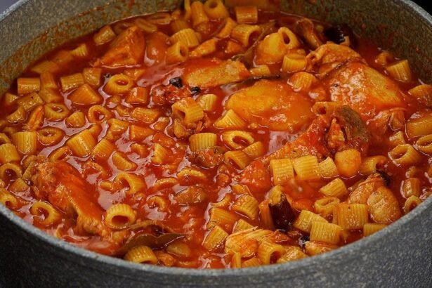 المقادير: 1 كيلوغرام أو 3 أكياس من المكرونة المقصوصة (يمكن اختيار أي شكل آخر) لتر عصير طماطم 3 ملاعق كبيرة من صلصة الطماطم (اختياري) بصل مفروم (حسب الرغبة) ثوم مفروم ليمون مجفف 3 قرون من الفلفل الحار السليم (اختياري) 2 فلفل حار من الألوان (أخضر، أصفر، أحمر) مفروم زيت نباتي سمنة بلدي ماء مغلي طريقة التحضير: في طاسة على النار،…